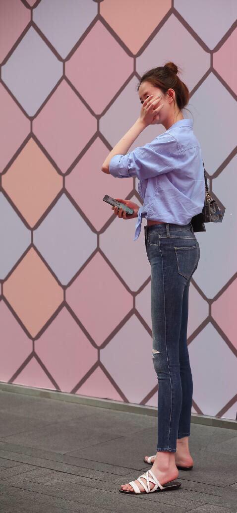 这位小姐姐的身材是非常纤细的,搭配着的这条高腰紧身牛仔裤,完美的凸显了小姐姐身材纤细的特点,破洞的设计是现在牛仔裤中非常常见的,这种设计简单大方,舒适的外观带有时尚的气质,搭一个白T恤,或者一件衬衫,再来一双小白鞋,这简直就是青春的标配啊!