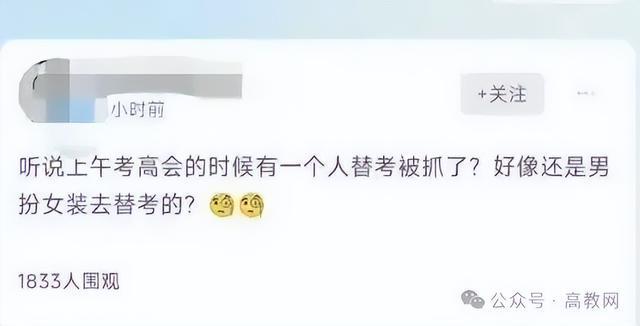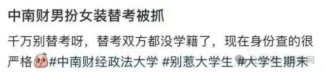 后续,有网友在网上披露了进步一步的详情:该事件为有人男扮女装,称“那个男的戴着假发和口罩去考试,然后被监考老师发现了”……