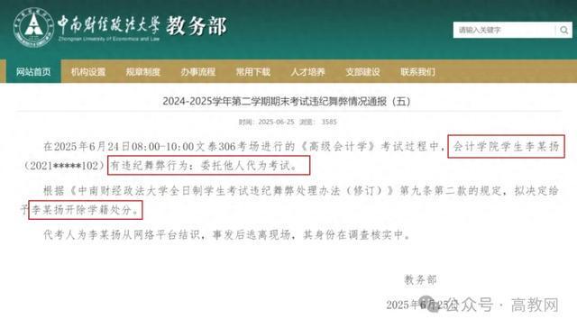 6月25日晚,中南财经政法大学官网发布通报会计学院学生李某某考试作弊,根据学校相关规定,拟决定给予李某扬开除学籍处分。