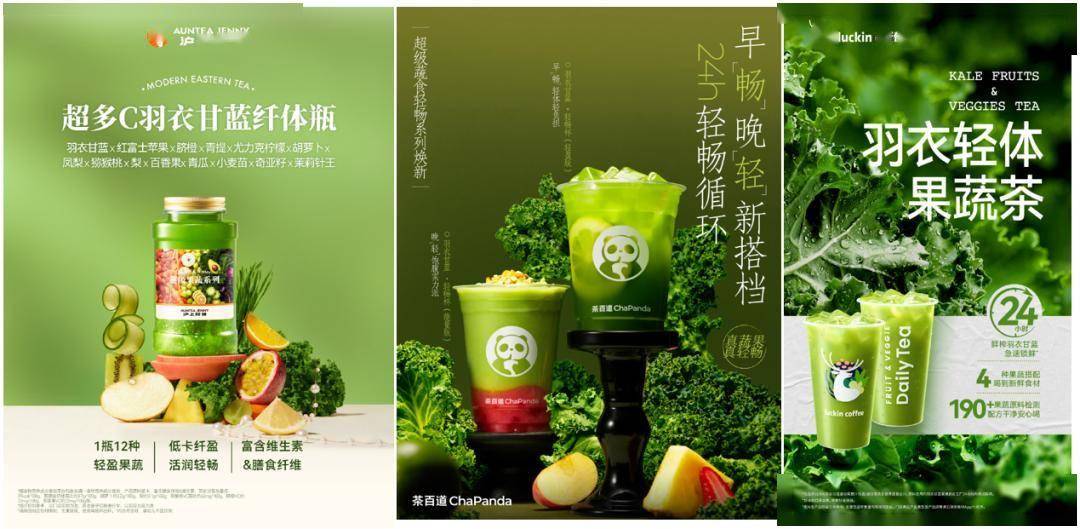 进入11月后行动更为密集:沪上阿姨推出“羽衣甘蓝纤体瓶”,内含羽衣甘蓝与阳光玫瑰;茶百道上新“轻畅羽衣甘蓝”等两款蔬食汁,加入牛油果等搭配;乐乐茶则连续推出“鲜配纤体瓶”和“鲜配发光瓶”,运用羽衣甘蓝、西芹、紫甘蓝等十余种果蔬混合制作。
