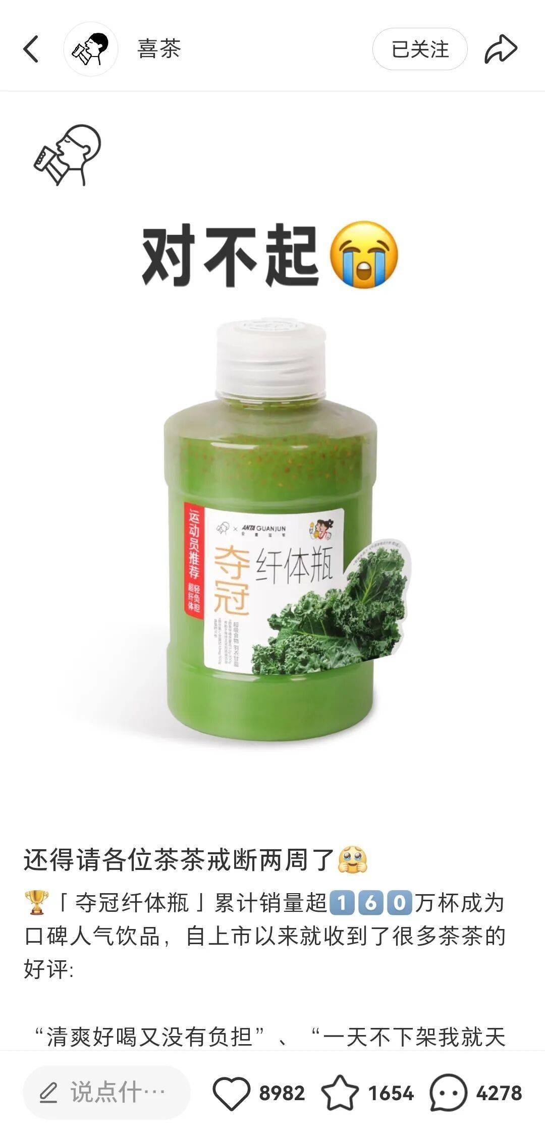 数据也可以说明这一切:2024年7月,“夺冠纤体瓶”一经上市便爆火全网,上线万杯,多地门店陆续售罄等待补货,随后进一步更名为“羽衣纤体瓶”。在供不应求的市场消费热情下,喜茶趁热打铁,于9月19日继续推出新品“去火纤体瓶”,形成“超级植物茶”系列,单日最高销量近 30万杯。