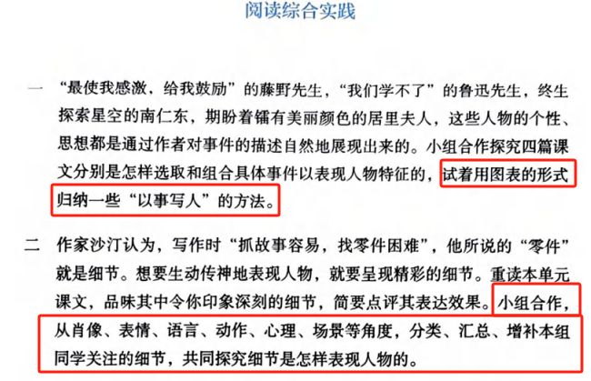 此外,每个单元末增加了“阅读综合实践”,以小组合作的形式进行整合实践学习。既有助于学生系统地学习和理解相关知识与技能,同时又提高了探究能力和团队合作能力。
