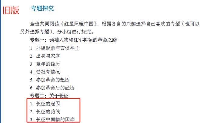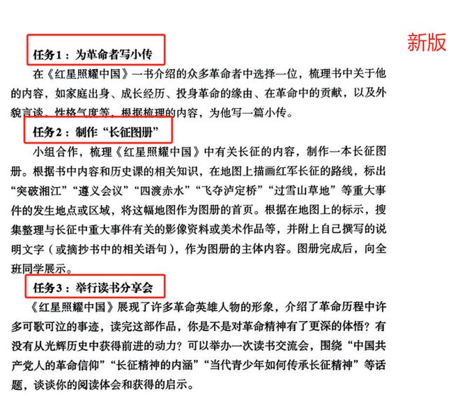 在阅读任务安排上,也从单纯的知识梳理,变为了综合性实践探究。比如旧版教材中只给出了探究领袖人物外貌、经历,长征的起因、路线等单一任务,而新版教材则要求学生以为革命者写小传、制作长征路线图等形式,进行深度探究。