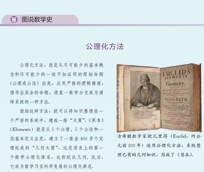 如八年级上册增加“图说数学史”等栏目,在正文中融入数学文化,使学生在学习数学知识的同时获得数学文化熏陶。