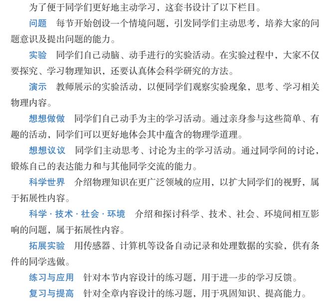 物理九年级教材结构更加清晰,从问题引导到概念陈述、材料补充,再到实验演示及拓展实验、练习与应用,实现了学-练闭环。