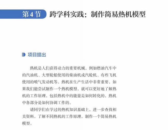新增拓展实验等栏目,有助于拓展学生视野和思维。同时还新增六节跨学科实践课程,如制作简易热机模型、为家庭节约用电提建议等,激发学生科学兴趣和精神,提升科学素质。